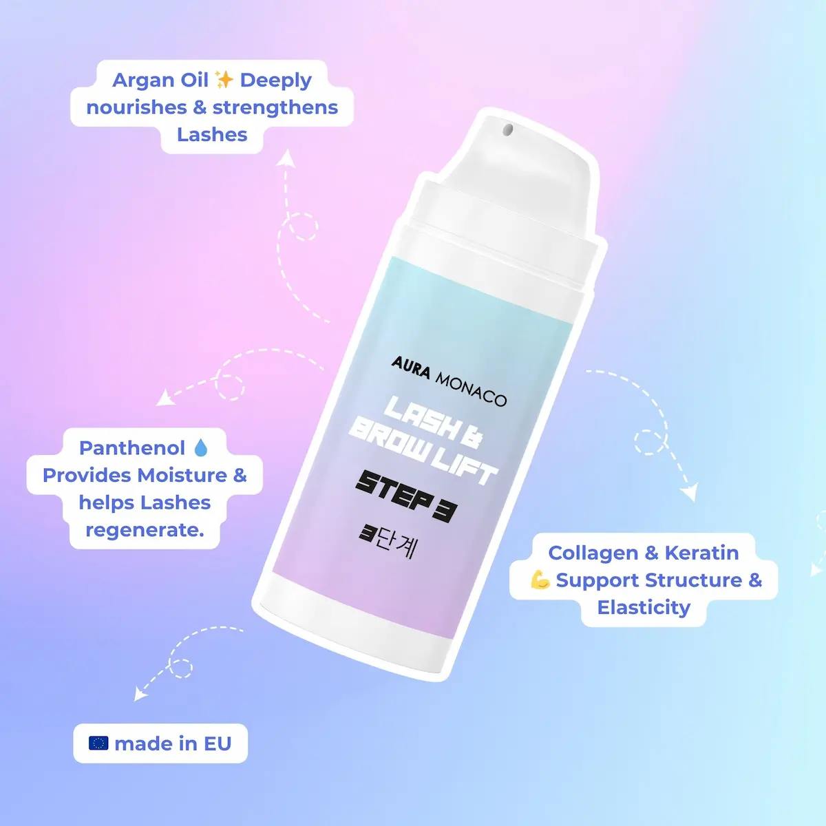Step 3 provides intensive care with collagen, keratin, panthenol, and argan oil. Lashes and brows are hydrated and protected.